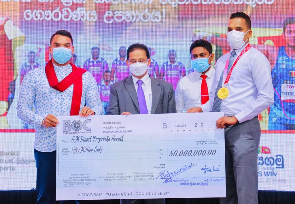 හෙල්ල විසිකිරිම ඉසව්වෙන් ලෝක වාර්තාව ද සමඟින් රන් පදක්කම හිමිකරගත් දිනේෂ් ප්රියන්ත හේරත් ක්රීඩකයාට ක්රීඩා අමාත්යාංශයෙන් රුපියල් කෝටි පහක මුදලක් හා ශ්රී ලංකා ක්රිකට් ආයතනයෙන් රුපියල් කෝටියක මුදලක් ඇතුළුව රුපියල් කෝටි හයක මුදලක් ප්රදානය කෙරිණි.