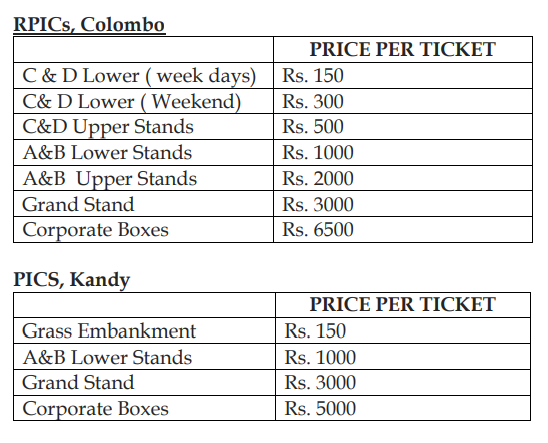 කොළඹ ආර්. ප්රේමදාස සහ පල්ලෙකැලේ ජාත්යන්තර ක්රීඩාංගණ වලදී පැවැත්වෙන මෙවර එල්.පී.එල්. තරගාවලියේ ප්රවේශ පත්ර රුපියල් 150 සිට රුපියල් 6500 දක්වා වූ මිල ගණන් යටතේ මිලදී ගත හැක.